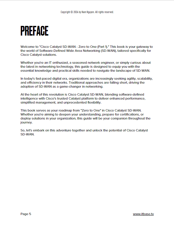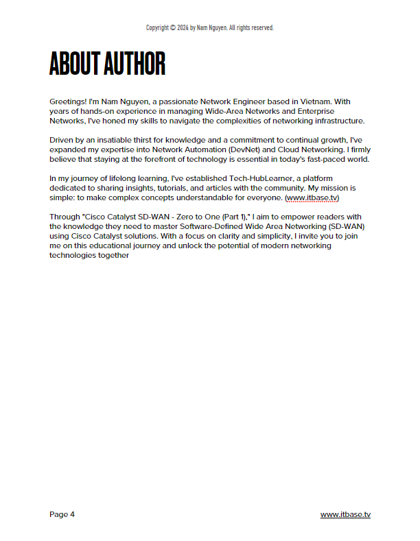 In this groundbreaking ebook, Nam Nguyen, a seasoned Network Engineer with years of experience in Wide-Area Networking and Enterprise Networks, distills complex networking concepts into easily digestible insights and practical strategies. Drawing from his wealth of expertise and his renowned blog, ITBase.tv, Nam brings his unique style and approachable tone to guide you through the intricacies of Cisco Catalyst SD-WAN with ease.